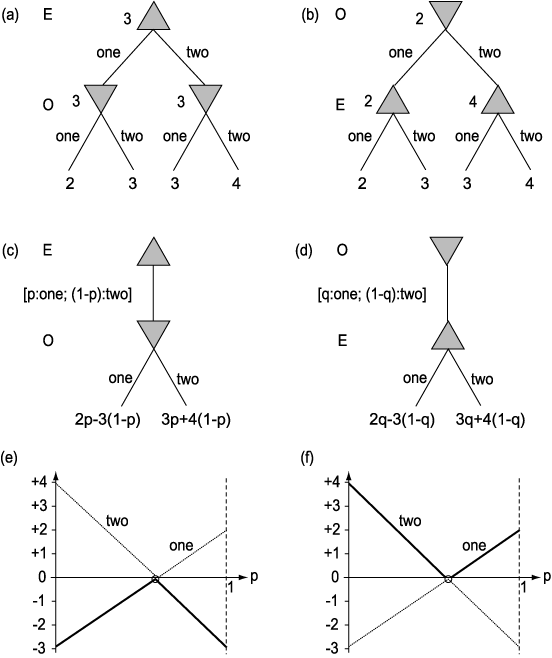 E E [p : one ; (1 - p) : two] O p O one E 2p - 3 (1 - p) = 5p - 3 -3p + 4 (1 - p) = 4 - 7p p x-axis O E p