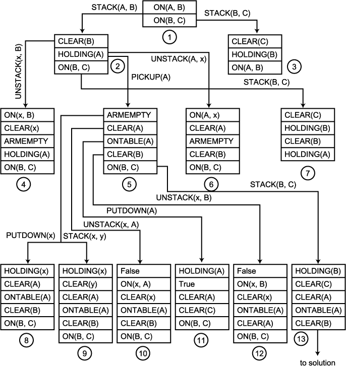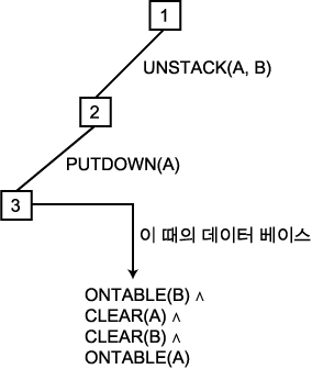 º¹ÀâÇÑ ¹®Á¦¸¦ ó¸®Çϱâ À§ÇØ, °ñÁ¶ °ø¸®¸¦ °¡´ÉÇÑ ÇÑ Àû°Ô »ç¿ëÇÏ´Â ±â¹ýÀÌ ÇÊ¿äÇÏ´Ù. À̸¦ ¸¸Á·ÇÏ´Â ÇÑ °¡Áö ±â¹ýÀº ÃʱâÀÇ ·Îº¸Æ® ¹®Á¦ Ç®ÀÌ ½Ã½ºÅÛÀÎ STRIPS ¿Í À̰ÍÀÇ ÈÄ¼Ó ½Ã½ºÅÛ¿¡ »ç¿ëµÈ ±â¹ýÀÌ´Ù. ÀÌ ¹æ¹ý¿¡¼, °¢ ÀÛ¿ëÀº ÀÛ¿ëÀÚ¿¡ ÀÇÇØ ÂüÀ¸·Î µÇ´Â »õ·Î¿î ¼ú¾î¸¦ Æ÷ÇÔÇÑ ¸íÁ¦ÀÇ ¸®½ºÆ®¿Í, ÀÛ¿ëÀÚ¿¡ ÀÇÇØ °ÅÁþÀ¸·Î µÇ´Â ÀÌÀüÀÇ ¼ú¾î¸¦ Æ÷ÇÔÇÑ ¸íÁ¦ÀÇ ¸®½ºÆ®·Î ±â¼úµÈ´Ù. ÀÌ µÎ °³ÀÇ ¸®½ºÆ®¸¦ °¢°¢ ADD ¹× DELETE ¶ó ºÎ¸¥´Ù. °¢ ÀÛ¿ëÀÚ¸¦ À§ÇØ ¶Ç ÇϳªÀÇ ¸®½ºÆ®°¡ ±ÔÁ¤µÇ´Âµ¥, À̰ÍÀº PRECONDITION À̶õ ¸®½ºÆ®·Î¼ ÀÛ¿ëÀÚ¸¦ Àû¿ëÇϱâ À§ÇØ ÂüÀ̾î¾ß¸¸ ÇÏ´Â ¼ú¾î¸¦ Æ÷ÇÔÇÑ ¸íÁ¦µéÀ» ±¸¼ºµÇ¾î ÀÖ´Ù. ±×¸° ½Ã½ºÅÛ (Green's system) ¿¡ »ç¿ëµÈ °ñÁ¶ °ø¸®°¡ STRIPS ¿¡ ¾Ï½ÃÀûÀ¸·Î ±ÔÁ¤µÇ¾î ÀÖ´Ù. ÀÛ¿ëÀÚÀÇ ADD ³ª DELETE ¸®½ºÆ®¿¡ Æ÷ÇԵǾîÀÖÁö ¾Ê´Â ¼ú¾î¸¦ Æ÷ÇÔÇÑ ¸íÁ¦´Â ÀÌ ÀÛ¿ëÀÚ¿¡ ÀÇÇØ ÀüÇô ¿µÇâÀ» ¹ÞÁö ¾Ê´Â´Ù°í °¡Á¤ÇÑ´Ù. ÀÌ´Â, °¢ ÀÛ¿ëÀÚ¸¦ ±ÔÁ¤ÇÒ ¶§, ÀÌ ÀÛ¿ëÀÚ¿Í °ü°èµÇÁö ¾Ê´Â °ÍÀº °í·ÁÇÒ Çʿ䰡 ¾øÀ½À» ÀǹÌÇÑ´Ù. ÀÌ´Â, °¢ ÀÛ¿ëÀÚ¸¦ ±ÔÁ¤ÇÒ ¶§, ÀÌ ÀÛ¿ëÀÚ¿Í °ü°èµÇÁö ¾Ê´Â °ÍÀº °í·ÁÇÒ Çʿ䰡 ¾øÀ½À» ÀǹÌÇÑ´Ù. µû¶ó¼, UNSTACK °ú COLOR ÀÇ °ü°è¸¦ ¾ð±ÞÇÒ Çʿ䰡 ¾ø´Ù. ¹°·Ð, À̰ÍÀº ÀÛ¿ëÀÌ ¼öÇàµÈ ÈÄ¿¡ ¿ÏÀüÇÑ ÀüüÀûÀÎ »óÅÂÀÇ ±â¼úÀ» °è»êÇϱâ À§ÇØ, °£´ÜÇÑ Á¤¸® Áõ¸í ±â¹ý°ú´Â ´Ù¸¥ ¾î¶² ±â¹ýÀÌ »ç¿ëµÇ¾î¾ß ÇÔÀ» ÀǹÌÇÑ´Ù.