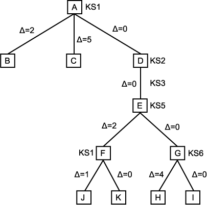 ÀÌ ¿¹¿¡¼ KS1 ¿¡ ÀÇÇØ µÎ °³ÀÇ °¡¼³ ³ëµå J ¿Í K °¡ ¸¸µé¾î ÁüÀ» ¾Ë ¼ö ÀÖ´Ù. ³ëµå K °¡ KS1 ¿¡°Ô °¡Àå À¯¸ÁÇÑ ³ëµå·Î º¸ÀÌÁö¸¸ ´Ù½Ã ³ëµå K ¸¦ Á¦°ÅÇÏ´Â ¿ÜºÎÀûÀÎ Á¦ÇÑ Á¶°ÇÀÌ Á¸ÀçÇÑ´Ù°í °¡Á¤ÇÏÀÚ. À̶§ ´Ù½Ã ÈÄÁø °úÁ¤ÀÌ ÇÊ¿äÇÏ´Ù. ÀÌ °æ¿ì °¡Àå ÀÛÀº ¥Ä °ªÀº ³ëµå J ÀÇ ¥Ä °ªÀÌ´Ù. À̶§ ´Ù½Ã ÈÄÁø °úÁ¤ÀÌ ÇÊ¿äÇÏ´Ù. ÀÌ °æ¿ì °¡Àå ÀÛÀº ¥Ä °ªÀº ³ëµå J ÀÇ ¥Ä °ªÀÌ´Ù. ±×·¯³ª ³ëµå J ´Â ³ëµå F ÀÇ ÈÄ°è ³ëµåÀ̸ç, ³ëµå F ÀÚü°¡ ¶Ç ´Ù¸¥ ÇϳªÀÇ ¼±ÅÃÀÌ µÉ ¼ö ÀÖÀ½À» ÁÖ¸ñÇ϶ó. ³ëµåÀÇ Å¸´ç¼º¿¡ ´ëÇÑ ºÒÈ®½Ç¼ºÀº ³ëµå J ÀÚüÀÇ ºÒÈ®½Ç¼º°ú À̰ÍÀÇ ¼±ÀÓ ³ëµåµéÀÇ ºÒÈ®½Ç¼º¿¡ ±âÀÎÇÑ °ÍÀÌ´Ù. ÀÌ·Î ÀÎÇØ ¥Ä °ª 2 ¸¦ °¡Áø ³ëµå B °¡ ¸¸µé¾î Áö¸ç, À̰ÍÀÌ °¡Àå À¯¸ÁÇÑ ³ëµå·Î º¸¿©Á®, ´ÙÀ½¿¡ Á¶»çµÈ´Ù.