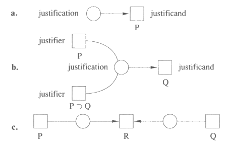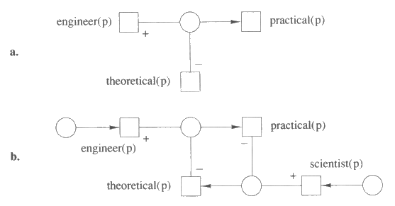 예를 들어, 모든 기술자들은 그가 특별히 이론적인 사람이라고 알려지지 않은 한 대체로 실용적인 성향을 갖는 것으로 여겨진다고 가정해 보자. 특정한 사람 p 에 대해 이 규칙은 그림 19a 와 같이 표현된다. 여기에서 + 로 표시된 노드는 IN justifier 이고 - 로 표시된 노드는 OUT justifier 이다. 그림 19a 는 engineer (p) 가 데이터베이스에 있고 theoretical (p) 가 데이터베이스에 없을 때 practical (p) 가 데이터베이스에 존재해야 한다는 사실을 명시하고 있다.