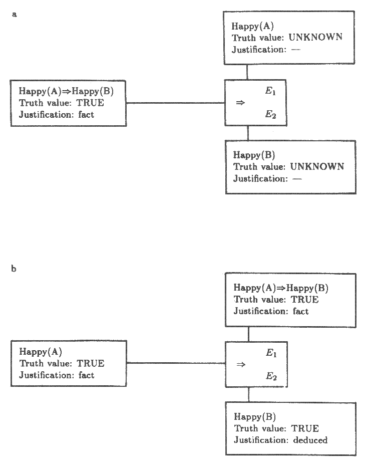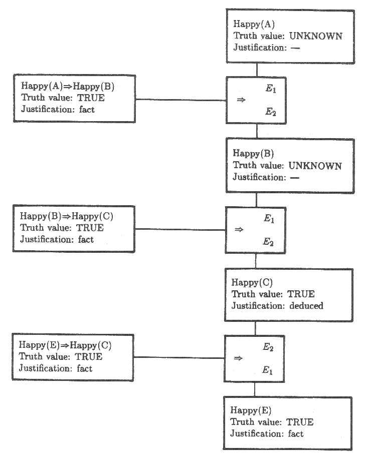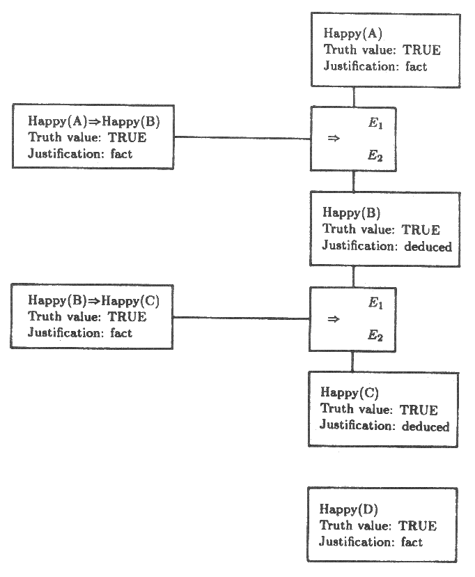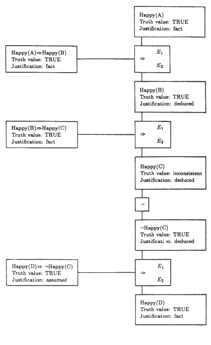 예를 들면 Happy(A) 가 TRUE 라는 가정을 철회함으로써 Happy(C) 는 TRUE 라는 결론을 철회하도록 만든다. 그러나 다음과 같이 확실한 사실로서 다섯번째 E 라는 사람은 행복하고 그의 행복은 C 의 행복을 초래한다고 가정하자.