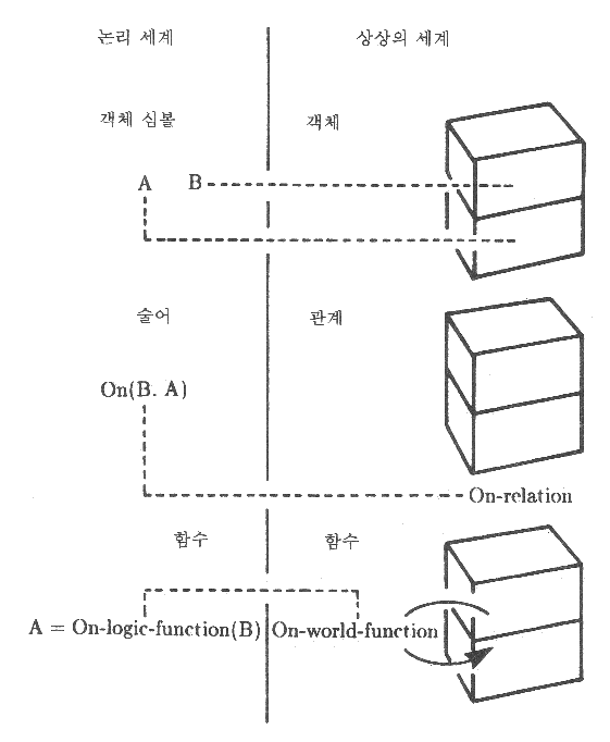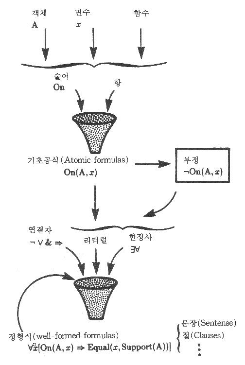 그림 2 : 논리의 어휘 비공식적으로 말해 예제 정형식 (well-formed formula) 은 다음을 의미한다. 즉, 특정한 객체 A 와 지정되지 않은 객체 X 가 술어 On 을 만족한다면 X 는 함수 support 를 객체 A 에 적용할 때 반환되는 값과 같음을 내포한다 (imply).