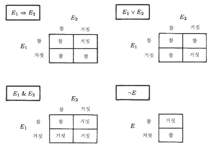 아마도 더 늦기 전에 연결자들인 ⇒, &, ∨ 그리고 ¬ 에 대해 보다 엄밀한 정의가 필요할 것이다. 함수로서 이들을 고찰해보면 각 변수의 가능한 조합에 대해 승인된 값을 열거해 봄으로써 정의하면 쉽다. 이것은 진리표 (truth table) 를 이용해서 그림 1 에 나타내었다.