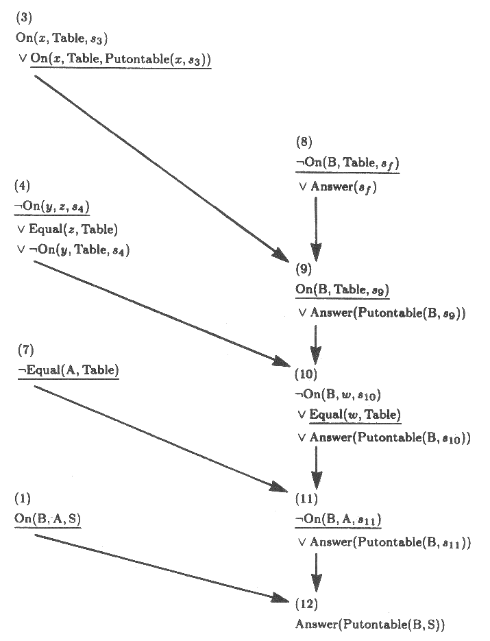 10. 논리를 사용하여 일련의 연산자 (operator sequences) 를 찾으려면 상황들을 추적 기록할 수 있는 어떤 기법이 요구된다. 보통 방법은 상황을 나타내는 인수들 (situation-indicating arguments) 을 갖는 술어 (predicates) 에 표시하는 것이다.
