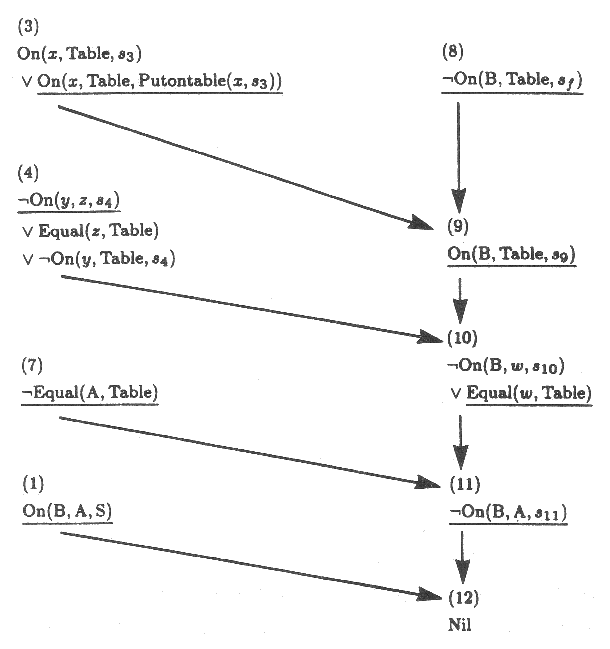 정리 증명을 위한 레졸루션의 개발은 비록 다른 사람들도 중요한 공헌을 했지만 J. A. Robinson [1965, 1968] 이 일반적으로 명성을 얻고 있다. 특별히 C. Crodell Green 은 그의 영향력 있는 논문에서 상황 변수와 Green 의 기법을 논리로 끌어들여 일련의 연산자들의 유도를 가능하게 하였다 [1969]. Green 의 논문은 또한 논리 프로그래밍의 아이디어를 소개 했다.