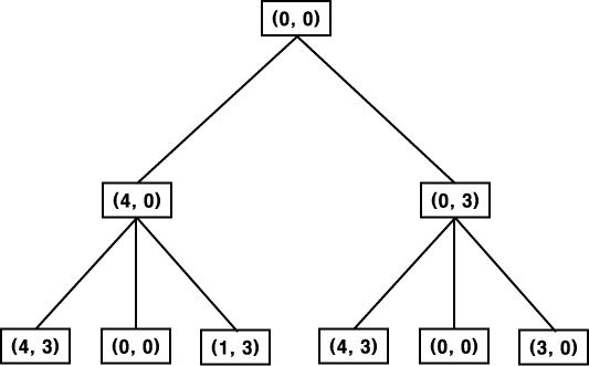 ¿¹¸¦ µé¸é, ±×¸² 4 ÀÇ Æ®¸®¿¡¼ ÇÑ ÁÖÀüÀÚ¿¡´Â 4 °¥·ÐÀÇ ¹°ÀÌ, ´Ù¸¥ Çϳª¿¡´Â 3 °¥·ÐÀÇ ¹°ÀÌ µé¾î ÀÖÀ½À» ³ªÅ¸³»´Â ³ëµå (4, 3) Àº ¸ÕÀú 4 °¥·Ð µéÀÌÀÇ ¹° ÁÖÀüÀÚ¸¦ ä¿î µÚ, 3 °¥·Ð µéÀÌÀÇ ¹° ÁÖÀüÀÚ¸¦ ä¿ì°Å³ª ±× ¹Ý´ëÀÇ ¼ø¼·Î ¹° ÁÖÀüÀÚ¸¦ ä¿ï ¶§ ¾ò¾îÁø´Ù. ÀÌ ¹®Á¦ÀÇ °æ¿ì, ¼öÇà ¼ø¼°¡ Áß¿äÇÏÁö ¾Ê±â ¶§¹®¿¡ ÀÌ µÎ ³ëµå¸¦ °è¼Ó ¼öÇàÇÒ Çʿ䰡 ¾ø´Ù. ÀÌ ¿¹·ÎºÎÅÍ Æ®¸®¸¦ µû¶ó Ž»ö °úÁ¤À» ¼öÇàÇÒ ¶§ ¹ß»ýÇÏ´Â ¶Ç ´Ù¸¥ ¹®Á¦¸¦ ¾Ë ¼ö ÀÖ´Ù. ¼¼¹øÂ° ·¹º§ÀÌ ³ëµå (0, 0) °¡ ÀÖ´Ù (»ç½Ç, À̰ÍÀº µÎ ¹ø ³ªÅ¸³´Ù). ±×·¯³ª À̰ÍÀº Æ®¸®ÀÇ ·çÆ® ³ëµå¿Í µ¿ÀÏÇÑ °ÍÀ¸·Î½á ÀÌ¹Ì Àü°³, ÆØÃ¢µÇ¾ú´Ù. ÀÌ °³ÀÇ °æ·Î´Â »õ·Î¿î ³ëµå·Î È®ÀåµÇÁö ¸øÇϱ⠶§¹®¿¡, À̰͵éÀ» ¾ø¾Ö°í ³ª¸ÓÁö ´Ù¸¥ °æ·Î¸¦ µû¶ó ¼öÇàÀ» °è¼ÓÇϸé È¿°úÀûÀÌ´Ù.