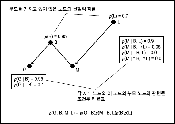 이진값을 갖는 변수가 4 개 있기 때문에 p (B = b, M = m, L = l, G = g) 와 같은 형태의 결합 확률은 총 16 개이다. 여기서 b, m, l, g 는 참 또는 거짓을 나타낸다. 로봇 설계자는 이들 결합 확률값이 0 과 1 사이이며 이들을 전부 더했을 때의 값이 1 이라는 제약조건하에 16 개의 확률값을 지정할 수 있다. 예를 들면 다음과 같다.