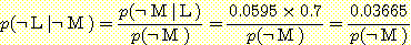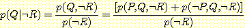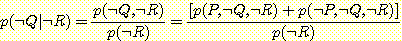 윗식의 값을 구하려면 p (¬ R) 값을 구해서 대입하면 된다. 한편, 위와 같은 방법으로 p (¬ Q | ¬ R) 값을 계산하고 p (Q | ¬ R) + p (¬ Q | ¬ R) = 1 이라는 성질을 이용하여 p (Q | ¬ R) 의 값을 구할 수도 있다. 후자의 방법으로 p (Q | ¬ R) 값을 구해 보자.