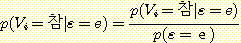 Vi 는 참 또는 거짓 값을 가질 수 있으므로 p (Vi = 참 | ε = e) 와 p (Vi =거짓 | ε = e) 를 구해야 한다. 사실은 이 둘 중의 하나만 구하면 된다. 왜냐하면 ε 의 값에 상관없이 p (Vi = 참 | ε = e) + p (Vi =거짓 | ε = e) = 1 이 되어야 하기 때문이다. 간단한 방법으로 p (Vi =참 | ε = e) 값을 계산함으로써 이 사실을 입증해 보자. 조건부 확률의 정의에 따라