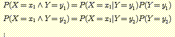 P(X|Y) = P(X) or P(Y|X) = P(Y) or P(X, Y) = P(X) P(Y)