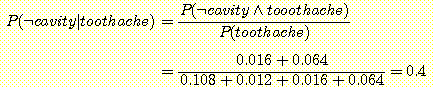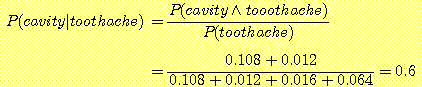 P(cavity ¡ý toothache) = 0.108 + 0.012 + 0.072 + 0.008 + 0.016 + 0.064 = 0.28