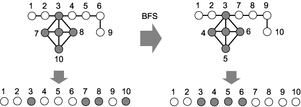 ÀÌ ¹æ¹ýÀº ±×·¡ÇÁ ºÐÇÒ ¹®Á¦¸¦ À§ÇÏ¿© ±×·¡ÇÁ¿¡ BFS (³Êºñ¿ì¼±Å½»ö, Breadth First Search) ¶Ç´Â DFS (±íÀ̿켱Ž»ö, Depth First Search) ¸¦ ½Ç½ÃÇÑ ´ÙÀ½ ±× ¹æ¹® ¼ø¼¿¡ ÀÇÇØ ¿°»öü»óÀÇ À¯ÀüÀÚÀÇ ¼ø¼¸¦ °áÁ¤ÇÏ´Â °ÍÀÌ´Ù. ÀÏÁ¡ ±³Â÷¸¦ ÇÏ´Â °æ¿ì, ½ºÅ°¸¶ÀÇ »ýÁ¸ È®·üÀº ½ºÅ°¸¶ÀÇ ±æÀÌ¿¡ ¹Ýºñ·ÊÇϴµ¥ (4.1 Àý¿¡ ¼³¸íµÊ) BFS ¸¦ ÀÌ¿ëÇÏ´Â Àç¹èÄ¡ ¹æ¹ýÀº ±×·¡ÇÁ ¹®Á¦¿¡¼ ¿ì¼ö ½ºÅ°¸¶ÀÇ ±æÀ̸¦ ÁÙ¿© ÁÖ´Â È¿°ú°¡ ÀÖÀ½ÀÌ ¹àÇôÁ³´Ù. ´ÙÁ¡ ±³Â÷ÀÇ °æ¿ì´Â ±æÀ̺¸´Ù ½ºÅ°¸¶ ³»¿¡¼ ƯÁ¤ ±âÈ£µéÀÌ ±ºÁýÀûÀÎ ºÐÆ÷¸¦ ÇÒ °æ¿ì »ýÁ¸¿¡ À¯¸®ÇÏ´Ù´Â °ÍÀÌ ¹àÇôÁ³´Âµ¥ DFS ¸¦ ÀÌ¿ëÇÑ Àç¹èÄ¡´Â ¿ì¼ö ½ºÅ°¸¶ÀÇ Æ¯Á¤ ±âÈ£µéÀÇ ºÐÆ÷¸¦ ±ºÁýÀûÀ¸·Î ¹Ù²Ù¾î ÁÖ´Â È¿°ú°¡ ÀÖ´Ù [Bui & Moon, 1998]. ±×¸² 2.3 Àº BFS ¸¦ ÀÌ¿ëÇÑ Àç¹èÄ¡ÀÇ ¿¹¸¦ º¸ÀδÙ.