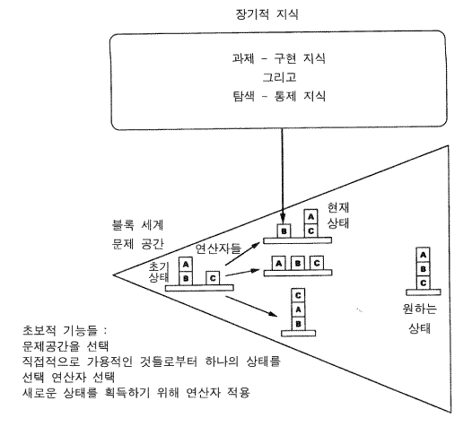 문제공간에 대해서 말할 것이 많지만, 여기서는 단지 간단히 언급하기로 한다. 문제공간은 생성자 generator 를 구성하는 연산자들과 검사인 원하는 상태의 재인 recognition 을 갖고 있는 생성과 검사의 형식이다. 그러므로 연산자들의 연쇄에 의해 실현된다. <이것은 블랙-박스 black-box 과정이 아니다.> 지식은 생성과정에서의 많은 다른 시점에서 생성을 중단시킬 수 있으므로 (즉 연산자의 적용 후에) , 생성이 지능적일 수 있는 방법을 열어놓았다. 생성-검사 상황에 관한 AI 로부터 얻는 하나의 중요한 교훈은, 검사로부터 생성자로의 지식의 전이는 항상 이익이 되므로 해결책의 후보자들은 결코 만들어질 필요가 없다는 것이다. 이것이 바로 상상할 수 있는 모든 연산자들을 갖고 있는 단일한 커다란 공간이 아니라 다중의 문제공간들이 존재해야 하는 이유이다. 커다란 공간에서의 연산자들의 연쇄들을 더 큰 연산자들 (대형-연산자들) 로 묶는 것이 지식을 검사로부터 생성자로 이동시키는 한 방법이다. 관련이 없는 것으로 알려진 연산자들을 제거하는 것도 또 하나의 방법이다. 그러므로 많은 문제 공간들 안에서 연산자들을 조직화하는 것은 효율적인 문제해결을 위해 지식을 묶는 하나의 방법이다.