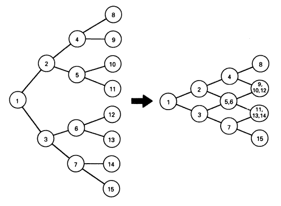 지식 탐색과 문제 탐색은 그것들의 특성에서 극단적으로 다르다. 문제 탐색은 그것의 공간을 구성한다. 서술적 자료구조로서 존재하는 유일한 상태들은 현재 상태와, 현재까지의 탐색에서 생성되어서 기억 연산들에 의해 접근 가능하도록 저장된 상태들의 몇몇이 그럴 가능성이 있다. 각각의 새로운 연산자의 적용은 행위자가 전에는 전혀 보지 못했던 새로운 상태를 생성한다. 문제 공간은 필연적으로 조합적이다 (더 많거나 더 적은 분기 요인에 따라) . 단지 그림 17 에 보이는 것처럼, 새로운 상태들이 서로 수렴할 경우에만, 문제공간의 위상 topology 은 차원에서 축소될 수 있다. 수렴은 단지 상태들의 비교와 확인 identification 에 의해서 발생할 수 있는데, 이는 새롭게 구성되는 상태가 어떤 다른 상태와 동일할 것인지를 사전에 알 수 없기 때문이다. 그러므로 상태들은 생성되고, 그 다음 중복 duplication 에 대해 처리되어야 한다.