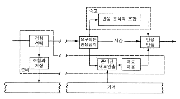 그림 18 에 그 상황이 제시되어 있다. 어떤 시점에 반응이 요구된다는 표시가 있다. 그러면 두 유형의 처리가 그 반응의 결정에 관여한다. 시스템은 숙고할 수 있다 —— 상황, 가능한 반응들, 그리고 그것들의 결과들 등의 분석을 위한 활동들을 한다. 우리가 살펴본 것처럼 불확실한 상황에서, 그것은 어떤 공간에서 적합한 반응을 찾기 위한 탐색으로 귀결될 것이다. 시스템은 또한 이미 준비되어 있는 여러 가지 반응들이나 반응들의 측면들을 가질 수도 있다. 물론 그것들은 이미 저장되어 있어야 한다. 그러한 준비된 것들을 사용하기 위해 시스템은 기억에 접근하고, 준비된 재료들을 인출하고, 그리고 현재의 사례에 적합하도록 그것을 고쳐야 한다.