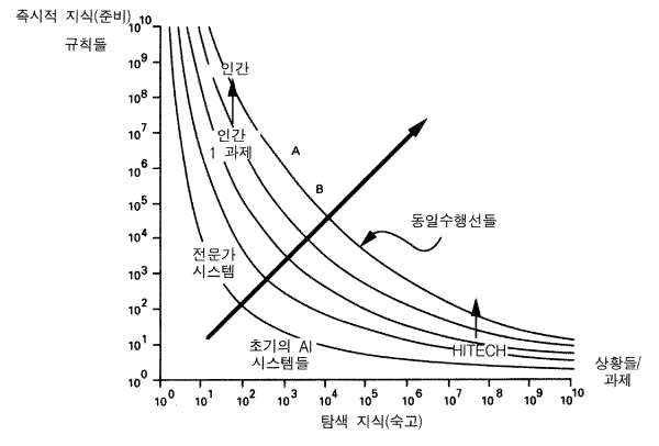 인간도 이와 동일한 그림에서 위치될 수 있다. 만약 우리가 비교적 범위가 좁은 과제에 관한 전문가 행동을 생각하면, 우리는 수 만개의 정보의 청크들이 관련되어 있음을 알 것이다 (Simon & Gilmartin, 1973) . 인간은 현재의 전문가 시스템들이 탐색하는 것보다는 많은 탐색을 하지만, 단지 수백 개의 상황들에서 탐색할 뿐, 수천 개의 상황들에서 하지는 않는다. 물론, 한 사람이 많은 영역들에서 전문성을 갖는다. 그러한 영역들을 통합하는 것은 인간을 지식 축에서 약 106 또는 108 의 청크까지로 상향 이동시키지만 탐색의 크기를 증가시키지는 않을 것인데, 이는 외부적으로 고정된 반응시간 (여기서는 최소한 몇 분이 소요됨) 과 구성이 기초연산들을 하는 속도가 일정하게 유지되고, 그것들에 의해서 탐색의 크기가 비교적 고정되어 있기 때문이다. 그러므로 이 도표는 하나의 성격적 특징, 즉 고정된 구성을 갖고 있는 주어진 시스템에서, 향상은 지식을 더함으로써 나타나지, 탐색 양을 더함으로써 나타나는 것이 아님을 보여준다. 그러므로 전형적으로 시스템들은 지식을 확보함에 따라, 수직축에서 상향 이동한다.