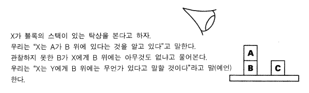광범위한 능력을 갖고 있는 시스템의 행동을 기술하는 한 방법은 그것들의 지식을 갖고 있고, 그 지식에 비추어 행동한다는 관점에서 보는 것이다. 그것을 어떻게 하는지를 보기 전에 그것이 무엇을 의미하는지 먼저 살펴보자. 그림 2 는 단순한 상황인 블록 세계를 보여주고 있는데, 그것은 지식을 갖고 있는 것으로 특징지워지는 시스템에 대한 적합하고 전형적인 예이다. 탁자가 있고, 그 위에 3 개의 블록 A, B, 그리고 C 가 있다. A 는 B 위에 있다. 어떤 행위자 X 는 그 상황을 관찰한다. 그러므로 우리는 A 가 B 위에 있다는 것을 X 가 알고 있다고 말할 수 있다. 그 상황을 관찰하지 못한 다른 행위자 Y 가 B 위에는 아무 것도 없는지 X 에게 묻는다. 별다른 생각없이 우리는 X 는 Y 에게 B 위에 무언가 있다고 말할 것이라고 믿는다. 우리는 사실상 X 반응에 대한 예측을 한 것이다. 이와 같은 상황이 정확히 발생했다고 가정하자 (정말로 그럴 듯한 이야기이지 않은가?) . 우리는 어떻게 X 의 행동을 예측할 수 있는가?