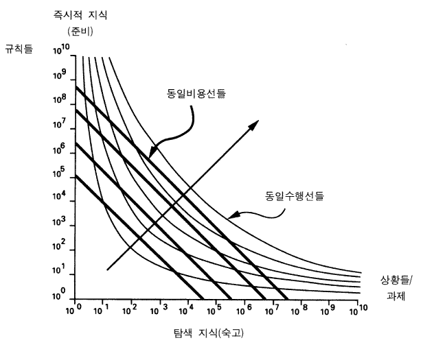 선들은 동일한 수행을 나타내는 곡선이지 동일한 계산비용을 나타내는 곡선들은 아니다. 지식 탐색이나 문제 탐색을 하는 데 계산 자원들이 사용되기 때문에, 그림 20 에 제시된 것처럼 동일-비용성들 equal-cost isobars 의 집합도 존재한다. 경제적 추론에서와 유사한 형태 (이 상황과 매우 흡사하다) 로 비용선들은 수행선들과 교차한다. 비용선들은 거의 직선일 수도 있다. 한 시스템에 대한 최적의 혼합점이 분명히 있는데, 그곳은 비용선과 최상의 수행선이 만나는 곳이다. 그림의 두꺼운 화살표는 그러한 최적-혼합점들을 통과한다. 그것들이 문제 탐색의 양과 지식 탐색의 양과의 최선의 교환을 구성한다.