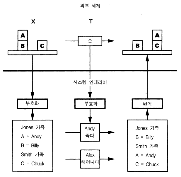 나는 그림 6 에 있는 블록 세계를 표상하는 데 덜 익숙한 방법을 선택했다. 블록의 각 구성은 가족 —— 존스 가족과 스미스 가족 —— 과 일치하며 가족의 구성원들은 가장 어린 사람이 맨 위에 있도록 나이순으로 정리한 블록들이다. 변환은 사람이 죽고 또는 태어나는 것이다. 만약 앤디 존스는 죽고 알렉스 스미스가 태어나면 존스 가족은 단지 빌리만 있고 스미스 가족은 알렉스와 처크가 있다. 주어진 블록 B 위에 아무 것도 없는가라는 질문을 하는 것은 그 가족의 가장 어린 사람이 누구인지 물어보는 것과 같다. 초기 상황에서는 빌리가 가장 어린 사람이 아니었지만, 앤디가 죽은 다음에는 그가 가장 어린 사람이 된다.