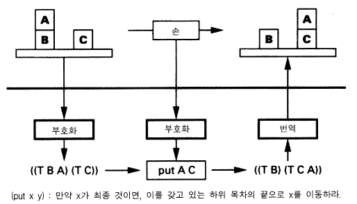그림 7 은 이 경로를 보여준다 .그것은 분명히 친숙하지만, 그렇다고 해서 그것의 중요성을 인식하지 못하면 안 된다. 표상매체는 하나의 목차 구조 list structure 이고 그 구조는 블록의 각 더미들에 대해 테이블 T 로 시작된 하위목록들을 갖고 있다. 그 표상 경로를 다시 한번 살펴보자. 우리는 외부 상황의 한 더미에 대해서는 T 와 C 를 갖고 있는 목록구조로 부호화함으로써 시작한다. 손의 동작은 목록구조를 변경시키는 내적 과정 (put A) 으로 부호화된다. <만약 x 가 그것의 하위목록의 마지막 항목이면, y 를 포함하고 있는 목록의 끝으로 그것을 옮겨라.> 일상적인 언어로 씌어졌지만 많은 독자들은 이 명령을 Lisp 로 즉시 기록할 것이다. 이 Lisp 프로그램은 외부 변환을 만족시키는 정확한 변환을 수행하도록 고정된 해석 방식 (Lisp 의 해석) 에 따라 구성된 하나의 표현이다. 물론 이 구성된 변환은 상황의 부호화가 어떻게 수립되느냐에 의존한다. 만약 맨 위의 블록들이 목록의 첫 번째 항목이고 테이블 T (불필요하게 됨) 가 생략된 것으로 만들어졌다면 (put x y) , 프로그램은 더 이상 표상법칙을 만족시키지 못한다 (정확히 못한다!) . 그러나 만족시키는 새로운 Lisp 함수는 쉽게 씌어질 수 있다. 기본적인 표상매체 —— 목록구조 —— 에서 블록 세계와 직접적으로 필요한 관계를 갖고 있는 것은 아무 것도 없다. 표상매체가 하는 것은 블록 세계 상황들의 각각에 대해 부호화하는 무한한 다양한 방식들을 제공하는 것이다. Lisp 함수들은 적합한 표상법칙들을 만족시킬 수 있도록 작성될 수 있다.