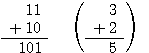 ¿ì¸®´Â °¡Àå ¿À¸¥ÂʺÎÅÍ ´õÇϱ⸦ ½ÃÀÛÇÏ°Ô µÇ´Âµ¥ 1 °ú 0 À» ´õÇÑ °á°ú´Â ºÐ¸íÈ÷ 1 ÀÌ´Ù. ±× ´ÙÀ½¿¡´Â ´ÙÀ½ ¿ÀÇ 1 ¿¡ 1 À» ´õÇØ¾ß Çϰí, ±× °á°ú´Â 10 ÀÌ µÈ´Ù. µû¶ó¼ 1 Àº ´ÙÀ½ ¿·Î ¿Ã¶ó°¡°Ô µÈ´Ù. ÀÌ ¿Àº ´Ù¸¥ ¼ö°¡ ¾ø±â ¶§¹®¿¡ ±× ÇÕÀº 1 ÀÌ µÈ´Ù. °á°ú·Î ³ª¿Â ÀÌÁø¼ö 101 Àº ½ÊÁø¼ö 5 ¿Í °°´Ù.