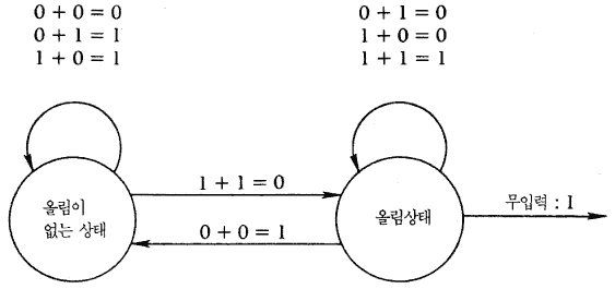 ±×¸²3.1 : µÎ °³ÀÇ ÀÌÁø ¼ýÀÚµéÀÇ ÇÕÀ» ±¸ÇÏ´Â À¯ÇÑ»óÅ ±â°è. ÀÌ ±â°è´Â ¿øÀ¸·Î Ç¥ÇöµÇ´Â µÎ »óŵéÀ» °®´Â´Ù. ÇÑ »óÅ´ ¿Ã¸²ÀÌ ÀÏ¾î³ »óÅÂÀ̸ç, ´Ù¸¥ ÇÑ»óÅ´ ¿Ã¸²ÀÌ ÀϾÁö ¾ÊÀº »óÅÂÀÌ´Ù. È»ìÇ¥´Â ÇÑ »óÅ¿¡¼ ´ÙÀ½ »óÅ·ÎÀÇ ÀüÀ̸¦ ³ªÅ¸³»°í, È»ìÇ¥ À§ÀÇ µî½ÄÀº ¼öÇà Áö½Ã¹®ÀÌ´Ù. Áï µî½ÄÀÇ ¿ÞÆíÀº ´õÇØÁú µÎ ¼ýÀÚµéÀÇ ÀԷ»óŸ¦ ³ªÅ¸³»°í, ¿À¸¥ÆíÀº ±â°è°¡ »êÃâÇÏ´Â °á°ú¸¦ ³ªÅ¸³½´Ù. ÀÌ¿Í °°ÀÌ ¿Ã¸²ÀÌ ¾ø´Â »óÅ¿¡¼ ½ÃÀ۵Ǿî, 1 + 1 À» ¼öÇàÇÑ °á°ú´Â 0 °ú ¿Ã¸²»óÅ·ΠÀüÀ̸¦ °¡Á®¿Â´Ù.