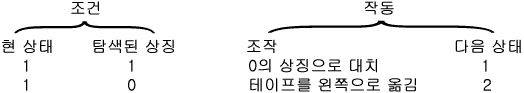 À¯ÇÑÇÑ »óÅÂÀÇ ±â°è¿¡ ¹«Á¦ÇÑÀûÀÎ Å×ÀÌÇÁ¸¦ ÀåÄ¡Çϸé, ±× °á°ú´Â °¡Àå °·ÂÇÑ °è»êÀåÄ¡ÀÎ Æ©¸µ±â°è°¡ µÈ´Ù. ±×°ÍÀº ³× °³ÀÇ ±âÃÊÀûÀÎ Á¶ÀÛ¸¸À¸·Î ¼öÇàÇÒ ¼ö ÀÖ´Ù. ±× Çϳª´Â Å×ÀÌÇÁ¿¡ 0À» 1·Î ±â·ÏÇÒ ¼ö ÀÖ´Â °ÍÀ̰í, µÑ°´Â Å×ÀÌÇÁ¿¡ 1À» 0À¸·Î ±â·ÏÇÒ ¼ö ÀÖ´Â °ÍÀ̸ç, ¼Â°´Â Å×ÀÌÇÁÀÇ Ä Çϳª¸¦ ¿ÞÂÊ ¿·À¸·Î ¿Å°Ü°¥ ¼ö ÀÖ´Â °ÍÀ̸ç, ³Ý°´Â Å×ÀÌÇÁÀÇ Ä Çϳª¸¦ ¿À¸¥ÂÊÀ¸·Î ¿Å°Ü°¥ ¼ö ÀÖ´Â °ÍÀÌ´Ù. Æ©¸µ±â°è´Â Áß°£°á°úµéÀ» Å×ÀÌÇÁ À§¿¡ ¾²¿©Áú ¼ö ÀÖµµ·Ï ºÒ·¯³¾ ¼ö ÀÖ´Ù´Â Á¡À» Á¦¿ÜÇϸé À¯ÇÑ»óÅÂÀÇ ±â°èó·³ Áö½Ãµé·Î ÀÌ·ç¾îÁø ÇÁ·Î±×·¥¿¡ ÀÇÇØ Á¦¾îµÈ´Ù. °¢°¢ÀÇ Áö½Ã´Â ÇϳªÀÇ Á¶°Ç°ú ±× Á¶°ÇÀÌ ¸¸Á·µÇ¸é ¼öÇàµÇ´Â ÀÛµ¿À» ¸í½ÃÇÑ´Ù. ±× Á¶°ÇÀº Å×ÀÌÇÁ À§¿¡ ÀûÈù »ó¡°ú ±â°èÀÇ »óÅ¿¡ ÀÇÇØ °áÁ¤µÈ´Ù. ±×¸®°í ÀÛµ¿Àº ³× °³ Áß ÇÑ Á¶ÀÛ°ú ±â°èÀÇ ´ÙÀ½ »óÅ·ÎÀÇ ÀüȯÀ» ¸»ÇÑ´Ù. ´ÙÀ½Àº Á˼öÀÇ ºø±Ý (tally , Á¦2Àå ÂüÁ¶) À¸·Î Ç¥ÇöµÈ µÎ ¼ö¸¦ ´õÇÏ´Â Æ©¸µ±â°è¿¡ ´ëÇÑ Áö½ÃµéÀÇ ÀϺÎÀÌ´Ù :