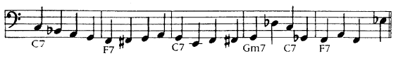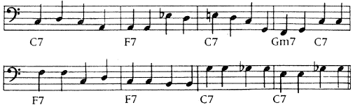 Çö´ë ÀçÁî¿¡¼ ´õºí º£À̽º ÁÖÀÚ´Â ÁÖ¾îÁø ÈÀ½ ¹è¿ (ÀÌÀü ÇÁ·Î±×·¥¿¡ ÀÇÇØ »ý¼ºµÈ ÈÀ½¹è¿ Á¾·ù) ¿¡ ¸ÂÃß¾î ÀúÀ½¼±À¸·Î ÁïÈï ¿¬ÁÖÇÑ´Ù. ±×¸² 14.3 Àº ÀüÇüÀûÀÎ ÀúÀ½¼±ÀÇ ÇÑ ´ÜÆíÀ» ±âÃÊ ÈÀ½°ú ÇÔ²² Á¦½ÃÇϰí ÀÖ´Ù. ±×°ÍÀº ÇÑ ¸¶µð¿¡ 4/4 ¹ÚÀÚ¾¿ ¸®µëÀÌ °íÁ¤µÈ ´Ü¼øÇÑ °ÍÀ¸·Î, ´Ù¸¥ À¯ÇüµéÀº Á»´õ º¹ÀâÇÏ´Ù. À½Ç¥ÀÇ ½ÇÁ¦ °É¸®´Â ½Ã°£Àº ÀçÁîÀÇ ¹ÚÀÚÀû ¸Æ¹Ú¿¡ ´ëÇÑ ¿¹¸®ÇÑ °¨°¢¿¡ ÀÇÁ¸ÇÑ´Ù. °á±¹ ±âÀúÀ²Àº ¿ì¸®·Î ÇÏ¿©±Ý ¸®µëÀÇ º¹ÀâÈ¿Í »ó°ü¾øÀÌ ¸á·Îµð¿¡ Á¢±ÙÇÏ´Â °ÍÀ» Çã¿ëÇÑ´Ù.