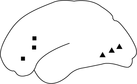 그림 7 단어를 눈으로 읽을 때 외측 피질에서 활성화되는 영역. 삼각형은 수동적 시각 과제와 관련되며 사각형은 의미 과제와 관련된다. (Posner, Peterson, Fox, & Raichle, 1988)