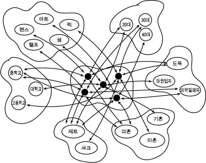 그림 10 표 1. 2 에서 나타난 사람들을 나타내는 데 필요한 단위와 상호 연결들. 이 중 화살표로 연결된 단위들은 상호 흥분적이다. 같은 구름 내의 모든 단위들은 상호 억제적이다. (Retrieving General and Specific Knowledge of Specifics by J. L. McCelland, 1981. 제 3차 인지과학 연차대회에서 발표된 논문임.)