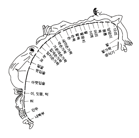 그림 9 체감각 피질의 횡단면이 보여 주는 인체의 지형도. (Kandel & Schwartz. 1984.)