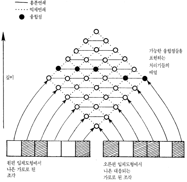 ÀÔüµµÇü¿¡ ´ëÇÑ ¿ÏÈ ÇÁ·Î±×·¥Àº ±×¸² 5.4 ¿Í °°Àº ÀÔüµµÇü ½Ö¿¡¼ ³ª¿Â ¿µéÀ» Ãʱâ ÀÔ·ÂÀ¸·Î ÃëÇϰí, 󸮱⠹è¿Àº °¡´ÉÇÑ À¶ÇÕµéÀÇ ÁýÇÕÀ» ã¾Æ³½´Ù. ÀÌ ¹è¿Àº »ïÂ÷¿øÀûÀ̰í, ±×°Í¿¡¼ ³ª¿Â ÀÌÂ÷¿øÀûÀÎ °¢°¢ÀÇ Á¶°¢Àº µÎ °³ÀÇ ÀÔüµµÇü¿¡¼ ³ª¿Â ÇϳªÀÇ ¼öÆò¿¿¡ ´ëÀÀÇÑ´Ù. ±×¸² 5.10 ÀÌ º¸¿©ÁÖ´Â °Í°ú °°ÀÌ ±×°ÍÀº µÎ ¿µé ³»ÀÇ Á¡µéÀÌ ¸¸µé ¼ö ÀÖ´Â °¡´ÉÇÑ À¶ÇÕ¿¡ µû¸¥ °¢±â ´Ù¸¥ ±íÀ̸¦ ¸ðµÎ Ç¥»óÇÑ´Ù. ±× ¹è¿ ³»ÀÇ °¢ 󸮱â´Â ÇϳªÀÇ ½Å°æ¼¼Æ÷¿Í ¾î´À Á¤µµ À¯»çÇÑ À¯ÇÑ»óÅÂÀÇ ÀåÄ¡ (Á¦ 3 Àå ÂüÁ¶) ÀÌ´Ù. ±×°ÍÀº Ȱ¼ºÀûÀ̰ųª ºñȰ¼ºÀûÀÌ´Ù. ¸¸¾à Ȱ¼ºÀûÀ̸é, ÀϹÝÀûÀ¸·Î ±×°ÍÀº ±× ¹è¿ÀÇ °¡ÀåÀÚ¸®¿¡¼ ÀÔ·ÂµÈ µÎ Á¡µé °£ÀÇ ÇÑ À¶ÇÕÁ¡À» Ç¥»óÇÑ´Ù. ±×°ÍÀÌ ºñȰ¼ºÀûÀ̶ó¸é, ±×°ÍÀº ÀϹÝÀûÀ¸·Î À¶ÇÕÁ¡ÀÌ ¾Æ´Ñ ÇÑ Á¡À» Ç¥»óÇÑ´Ù. µ¶Æ¯¼º Á¦¾à°ú ¿¬¼Ó¼º Á¦¾àÀº Á÷Á¢ÀûÀ¸·Î ±¸ÇöµÈ´Ù. 󸮱âµéÀº °°Àº ±íÀÌÀÇ Æò¸é¿¡ ÀÖ´Â ÀÌ¿ôÇÑ °Íµé°ú ´Ù¸¥ ¼öÆò¸é¿¡ ÀÖ´Â ÀÌ¿ôÇÑ °Íµé¿¡¼ºÎÅÍ (¿¬¼Ó¼º Á¦¾à¿¡ µû¶ó) ÈïºÐÀ» ¹Þ´Â´Ù. ±×°ÍµéÀº µ¿ÀÏ ½Ã¼± ³»ÀÇ Ã³¸®±âµé·ÎºÎÅÍ (µ¶Æ¯¼º Á¦¾à¿¡ µû¶ó) ¾ïÁ¦¸¦ ¹Þ´Â´Ù. 󸮱âµéÀº ¿ªÄ¡ (threshold) ¸¦ °¡Áö¸ç, ÈïºÐ°ú ¾ïÁ¦ÀÇ Á¶ÇÕÀÌ ¿ªÄ¡°ªÀ» ³ÑÀ» ¶§¿¡¸¸ Ȱ¼ºÈµÈ´Ù. ÀÔüµµÇüÀÌ ±× ¹è¿·Î ÀÔ·ÂµÈ ÈÄ, ±×°ÍÀº ÀÏ·ÃÀÇ Áֱ⸦ ÅëÇØ ÁøÇàµÇ¸ç ±×°ÍÀÌ ¾ÈÁ¤µÈ ÇüÅ (configuration) ·Î Á¤ÂøÇÒ ¶§±îÁö °è¼ÓµÈ´Ù. ÀÌ ÇüÅ´ µÎ ÀÔüµµÇüµé °£ÀÇ ÀûÀýÇÑ ´ëÀÀÀ» Ç¥»óÇϸç, ÀÔüµµÇü ³»ÀÇ °¢ Á¡ÀÇ »ó´ëÀûÀÎ ±íÀ̸¦ ¸í·áȽÃŲ´Ù.