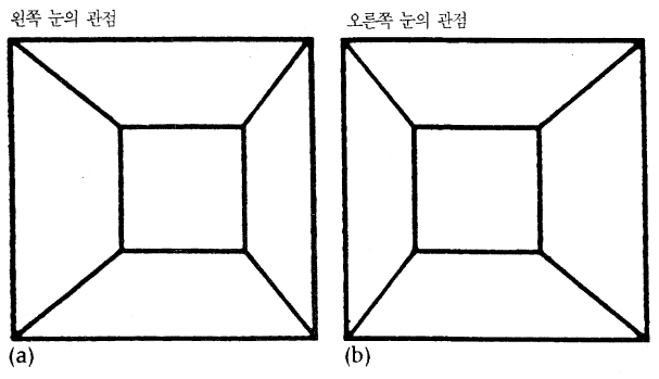 ÀÔü°æ (stereoscope) Àº ºòÅ丮¾Æ ½Ã´ëÀÇ °í¾ÈǰÀ¸·Î¼, ÇÑ Àå¸é¿¡ ´ëÇÑ (¾à°£ ´Ù¸¥ °üÁ¡¿¡¼ ÂïÀº) µÎ »çÁøµéÀ» µÎ ´«¿¡ °¢±â ºÐ¸®ÇÏ¿© Á¦½ÃÇÏ´Â °ÍÀÌ´Ù. ½Ã°¢ ü°è´Â ÀÌ µÎ ¿µ»óÀ» À¶ÇÕÇÔÀ¸·Î½á, º¸´Â »ç¶÷À¸·Î ÇÏ¿©±Ý »ý»ýÇÑ ±íÀ̰¡ ÀÖ´Â ÇϳªÀÇ ´ÜÀÏÇÑ Àå¸éÀ» º¸°Ô ÇÑ´Ù. ¿©·¯ºÐÀº ÀÛÀº »ç°¢ °Å¿ï µÎ °³¸¦ ¸Å´Þ°í¼, ±×¸² 5.2 ¿¡ ³ª¿À´Â ¹è¿·Î ±× ´ÙÀ½ ÆäÀÌÁöµé¿¡ ³ª¿À´Â ±×¸²µéÀ» ºñÃãÀ¸·Î½á ´Ü¼øÇÑ ÀÔü°æÀ» ±¸¼ºÇÒ ¼ö ÀÖ´Ù. ¿ÞÂÊ ´«Àº ¿ÞÆí »çÁøÀ» , ¿À¸¥ÂÊ ´«Àº ¿À¸¥Æí »çÁøÀ» º¸°í, µÎ ¿µ»óµéÀÌ À¶ÇÕµÉ ¼ö ÀÖµµ·Ï È®ÀÎÇØ º¸ÀÚ. ¸¸¾à ¿©·¯ºÐÀÌ ±×¸² 5.3 (a) ¿Í (b) ¸¦ º»´Ù¸é, ±×°ÍµéÀº °©Àڱ⠱íÀ̰¡ µå·¯³¯ °ÍÀÌ´Ù. ¿©·¯ºÐÀº Ã¥À» °Å²Ù·Î µ¹·Áº¼ ¼ö ÀÖ°í, ±×·¯¸é ±× ±íÀÌÀÇ È¿°ú°¡ ¹Ý´ë·Î ³ªÅ¸³ª¾ß ÇÒ °ÍÀÌ´Ù. ¾î¶² »ç¶÷µé¿¡°Ô´Â ±íÀ̰¡ 1 ºÐÀ̳ª 2 ºÐ °É·Á ³ªÅ¸³´Ù. ±×·¯³ª ´Ù¸¥ »ç¶÷µé, ¿¹¸¦µé¾î ¾àÇÑ »ç½Ã³ª <¾à½Ã (lazy eye)>, ±× ¿ÜÀÇ ¾àÇÑ ½Ã°¢Àû °áÇÔÀ» °Þ°í ÀÖ´Â ¾à 10 ÆÛ¼¾Æ®ÀÇ »ç¶÷µé¿¡°Ô´Â ±×°ÍÀÌ ÀüÇô ³ªÅ¸³ªÁö ¾ÊÀ» ¼öµµ ÀÖ´Ù.