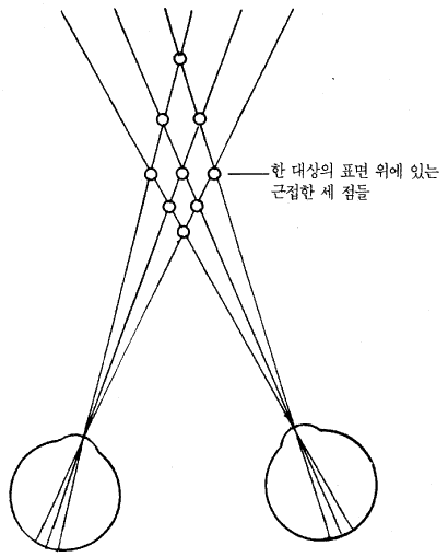 ¿©·¯ºÐÀº ÀÔü½Ã°¡ ¼³¸íÇϱ⠽¬¿î °ÍÀ̶ó°í »ý°¢ÇÒÁö ¸ð¸£³ª ±×·¸Áö ¾Ê´Ù. ¿Ö ±×·±Áö¿¡ ´ëÇØ ¾ÆÁÖ ÁÁÀº ÀÌÀ¯°¡ ÀÖ´Ù. ¾ç¾È½Ã Â÷À̰¡ ÃøÁ¤µÉ ¼ö ÀÖÀ¸·Á¸é, ÇÑ Àå¸é ³»ÀÇ °¢ Á¡¿¡ ´ëÀÀµÇ´Â Åõ»çÁ¡µé (¸Á¸·µé¿¡¼ÀÇ) Àº µÎ ½Ã°¢ »óÀÌ ¼·Î ´ëÀÀµÇ¾î¾ß¸¸ ÇÑ´Ù. ÀÌ ´Ü°è°¡ ¼ö¼ö²²³¢ÀÌ´Ù. µÎ ¿µ»óµé°£¿¡ ¾ç¾È½Ã Â÷À̰¡ Àֱ⠶§¹®¿¡ ¸Á¸·ÀÇ µ¿ÀÏÇÑ Àå¼Ò¸¦ Ž»öÇØ º¸´Â °ÍÀº ¼Ò¿ëÀÌ ¾ø´Ù. ÇÑ ¹æ½ÄÀº ±× Àå¸é ³»ÀÇ ´ë»óµéÀ» ÆÄ¾ÇÇϰí, ±×¸®°í µÎ ¿µ»óµéÀÇ ¿©·¯ ºÎºÐµéÀ» ¸ÂÃß¾î º¸´Â °ÍÀÌ´Ù. ÀÌ·¯ÇÑ ¹æ¹ýÀº ´ë»óµéÀÇ ±¸Á¶¸¦ »ç¿ëÇÏ¿© ¿µ»óµé ³»ÀÇ Á¡µéÀ» ¸ÂÃß¾î º¸´Â ÇÏÀ§ ¼öÁØ °úÁ¦¸¦ ÁøÇà½ÃŲ´Ù. ÀϹÝÀûÀ¸·Î ÀÌ´Â <ÇÏÇâ (top - down)> 󸮷Π¾Ë·ÁÁø °ÍÀÇ ÇÑ ¿¹ÀÌ´Ù. ±×·¯³ª ÀÔü½Ã¿¡ ÀÇÇØ ´ë»çÀÇ »ó´ëÀûÀÎ ±íÀÌ¿Í ±× Ç¥¸éÀÇ ¹æÇâÀÌ È®Á¤µÇ±â ÀÌÀü¿¡ ´ë»óÀÇ Á¤Ã¼°¡ ÆÄ¾ÇµÉ ¼ö ÀÖ´Ù´Â °ÍÀº »ó»óÇÏ±â ¾î·Æ´Ù. ¶Ç ´Ù¸¥ ÀýÂ÷´Â ȸ»ö ¼öÁØ ¹è¿µé ½ÖÀÇ °µµ°ªÀ» ¸ÂÃß¾î º¸´Â °ÍÀÌ´Ù. ÀÌ ¹æ¹ýÀº °¡Àå ³·Àº ÇüÅÂÀÇ ÀڷḦ »ç¿ëÇϸç, ÀϹÝÀûÀ¸·Î <»óÇâ (bottom - up)> 󸮷Π¾Ë·ÁÁø °ÍÀÇ ÇÑ ¿¹°¡ µÈ´Ù. ±×·¯³ª ºÒÇàÈ÷µµ ´ëÀÀµÇ´Â µÎ Á¡µéÀÇ °µµ´Â µÎ´«¿¡¼ ¼·Î ¾ÆÁÖ ´Ù¸¦ ¼öµµ Àֱ⠶§¹®¿¡ °µµ°ªÀ¸·Î ÀÔüÁö°¢À» ´Ù·ê ¼ö ÀÖ´Â ¹æ¹ýÀº ¾ø´Ù. ¸¸¾à ¿©·¯ºÐÀÌ ÇÑ ´«¿¡ ¼±±Û¶ó½º ¾È°æ¾Ë Çϳª¸¦ °ÉÄ£´Ù¸é, ±× ¾È°æ¾ËÀÌ ÇÑ´«¿¡ µé¾î¿À´Â ºûÀÇ °µµ¸¦ °¨¼Ò½ÃŰ´õ¶óµµ ¿©·¯ºÐÀº ¿©ÀüÈ÷ ±íÀ̰¡ ÀÖ´Â ¼¼»óÀ» º¼ °ÍÀÌ´Ù.