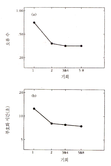 그림 14 LISP 튜터에서 나온 자료. (a) 는 연습 기회 수의 함수로서 매 산출당 오류 수 (최대 3이고, (b) 는 연습량의 함수로서 산출을 정확하게 부호화 하는데 걸리는 시간이다.