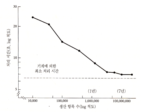 그림 1 경험량의 함수로서 궐련 하나를 생산하는 시간. (Crossman, 1959.)