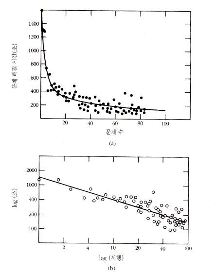 연습 효과는 기하와 같은 증명에 정당성을 부여하는 등의 복잡한 문제 해결을 포함하는 영역에서도 연구되어 왔다(Neves & Anderson, 1981). 그림 2 는 기하 영역의 멱함수를 정상 척도와 대수 척도로 보여 준다. 이 함수는 많은 연습으로 인한 이득이 급격히 감소하지만, 연습을 많이 할수록 약간의 이득은 계속 있음을 보여 준다.
