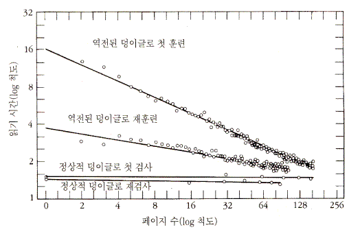 그림 4 콜러스 등 (Kolers, et al.,1975)의 일기 기술 실험에서의 피험자들이 1 년 이상의 간격을 둔 두 검사에서 보여 준 결과. 피험자들은 정상적인 덩이글이 중간중간 삽입된 200 페이지의 역전된 덩이글로 훈련 받았다. 1 년 후 역전된 덩이글 100 페이지로 다시 훈련 받았으나 여기서도 정상 덩이글이 중간중간 삽입되어 있었다. 제시된 결과는 기술 습득에 미치는 연습 효과를 보여 준다. 읽기 시간과 연습된 페이지의 수 모두가 대수 (log) 척도로 표시되어 있다 (Kolers. 1976.).