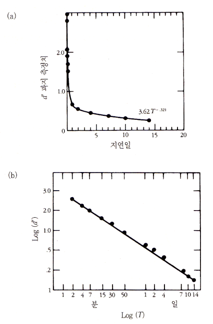 여기서 재인은 지연이 늘어나면서 체계적으로 저하됨을 알 수 있다. 이 변화는 부적으로 가속화된다. 즉, 변화율은 지연 기간이 길어지면서 점차 작아진다. 그림 1b 에서 필지는 수행 척도와 지연을 대수로 바꾸어 자료를 재구성하였다. 놀랍게도, 이 함수는 선형을 이룬다