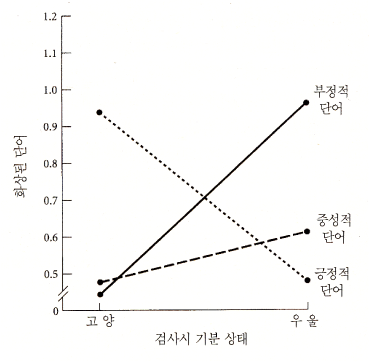 그림 9 고양된 및 우울한 기분 상태에서 긍정적, 부정적 및 중성적 특성의 단어 회상. (Teasdale & Russell, 1987.)