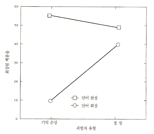 그림 10 기억 손상 환자들과 정상 피험자들이 학습한 단어를 회상하거나 완성시키는 능력. (Graf. Squire, & Mandler, 1984.)