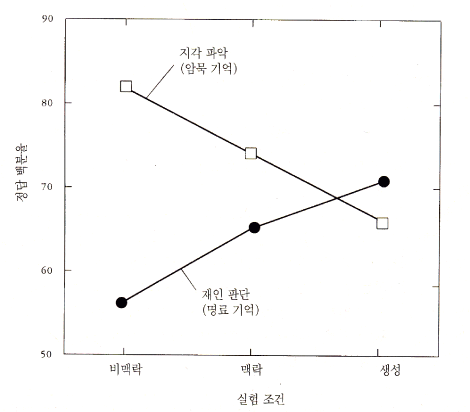 최근의 많은 연구들 (Schacter, 1987 ; Richardson-Klavehn & Bjork, 1988) 이 정상 피험자들에게서의 암묵 기억과 명료 기억 간의 해리를 주목했다. 이 집단에서는 암묵적 기억의 존재에 대한 의식이 전혀 없는 기억 손상 환자들에게서 볼 수 있는 심각한 해리 증상을 찾아보기가 어렵다. 그러나, 어떤 변수들이 암묵 기억 검사에 미치는 효과와는 다른 효과를 명료 기억 검사에 미치고 있음이 입증되었다. 예를 들면, 자코비 (Jacoby, 1983) 는 피험자들에게 여자와 같은 단어를 있는 그대로 학습하게 하거나 (비맥락 조건), 남자 – 여자처럼 반대말로 학습하게 하거나 (맥락 조건) 도는 반대말로서 그 단어를 생성하게 하였다. 나중 조건에서 피험자들은 남자를 보고 여자를 말해야 한다.