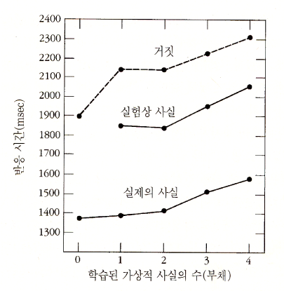 그림 5 루이스와 앤더슨 (Lewis & Anderson. 1976) 에서 나온 반응 시간, 과제는 공적 인물에 관한 사실 및 가상적인 사실은 인정하고, 그렇지 않은 것들은 모든 판단 시간이 증가함을 보여 준다.