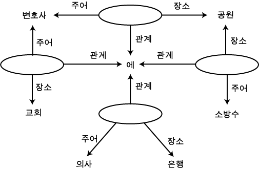 그림 4 앤더슨 (Anderson, 1974a) 실험에 사용된 네 문장들의 망조직 표상. 문장들은 의사가 은행에 있다, 소방수가 공원에 있다, 변호사가 교회에 있다 및 변호사가 공원에 있다이다.
