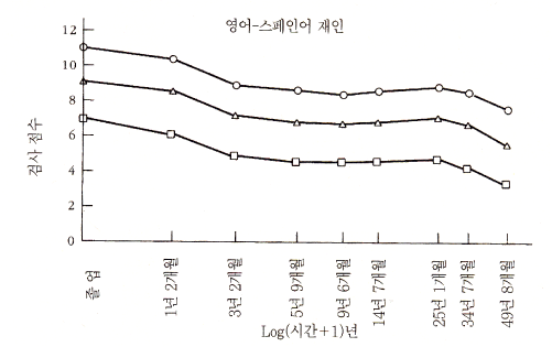 자료는 상당한 연습효과로 조합된 지식이 서서히 쇠잔함을 보여 준다. 이 자료에서 파지 함수는 3 년과 25 년 사이에 거의 평평하고 (멱함수가 예언 하듯이), 25 년부터 49 년에 걸쳐 약간 심한 경사를 보여 준다. (멱함수가 예언한 것보다 망각이 더 빠르다), 바릭 (개인적인 언급) 은 이 최종 경사가 노쇠에 따른 생리적 쇠퇴와 관련된다고 본다.