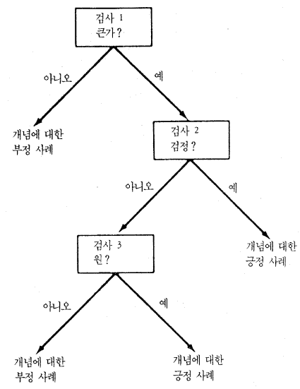±×¸² 13.3 ¿¡ ÀÖ´Â ¸ð¾çµéÀÌ ÁÖ¾îÁø´Ù¸é, ±× ÇÁ·Î±×·¥Àº ¸ÕÀú ±× °³³äÀÇ ±àÁ¤ÀûÀÎ »ç·Êµé°ú ºÎÁ¤ÀûÀÎ »ç·Êµé ¸ðµÎ¿¡ °øÅëÀûÀÎ ¾î¶² Ư¼ºµéÀÌ ÀÖ´ÂÁö¸¦ °ËÅäÇϰí, ÀÌ·¯ÇÑ Æ¯¼ºµéÀ» ÀûÀýÇÏÁö ¾ÊÀº °ÍÀ¸·Î °£ÁÖÇϰí À̵éÀ» ¹èÁ¦ÇÑ´Ù. ÀÌ ±×¸²¿¡´Â ÀüüÀûÀ¸·Î °øÅëÀûÀΠƯ¼ºÀÌ ¾Æ¹«°Íµµ ¾ø´Ù. ±× ´ÙÀ½¿¡´Â ±àÁ¤Àû »ç·Ê¿¡´Â ¸ðµÎ ¾î¶² °øÅëÀûÀΠƯ¼ºµéÀÌ ÀÖÁö¸¸ ºÎÁ¤ÀûÀÎ »ç·Ê¿¡´Â °øÅë Æ¯¼ºÀÌ ¾ø´ÂÁö¸¦ °ËÅäÇÑ´Ù. ¸¸¾à ±×·¸´Ù¸é, ¾î¶² Ç׸ñÀÌ°Ç ÀÌ Æ¯¼º¿¡ ´ëÇÑ °áÁ¤ÀÌ ±× Ç׸ñÀ» ¹üÁÖÈÇÑ´Ù. ±×¸²¿¡ ³ª¿À´Â ¸ð¾çµé¿¡¼´Â ±×·¯ÇÑ Æ¯¼ºÀÌ ¾øÀ¸¸ç, µû¶ó¼ ±× ÇÁ·Î±×·¥Àº ´ÙÀ½ ´Ü°è·Î ³Ñ¾î°£´Ù. ´ÙÀ½ ´Ü°è¿¡¼ ÇÁ·Î±×·¥Àº ±àÁ¤Àû »ç·Êµé¿¡¼ ºó¹øÇÏ°Ô ³ªÅ¸³ª´Â ÇÑ Æ¯¼ºÀ» ¹ß°ßÇÑ´Ù. ¿©·¯ Ư¼ºµéÀÌ ¶È°°ÀÌ ºó¹øÇÏ°Ô ¹ß»ýÇÒ ¶§¿¡´Â ±× ÇÁ·Î±×·¥Àº ¾î´À Çϳª¸¦ ÀÚÀÇÀûÀ¸·Î ¼±ÅÃÇÑ´Ù. ÇöÀçÀÇ °æ¿ì¿¡¼´Â, ¿¹¸¦ µéÀÚ¸é <Å©´Ù> ´Â Ư¼ºÀ» ¼±ÅÃÇϸç, ±×°ÍÀ» ³ª¹« ºÐ·ùµµ½ÄÀÇ Ã¹ °áÁ¤À¸·Î ¼³Á¤ÇÑ´Ù (±×¸² 13.4 ÂüÁ¶). ±× °áÁ¤Àº ±×¸²ÀÇ ¸ð¾çµéÀ» µÎ À¯¸ñÀ¸·Î ³ª´©°í, ÀÌ µÎ À¯¸ñµéÀº °¢±â ±× ÀÚü·Î ´Ù½Ã ¼¼ºÐÇÏ¿© ¹üÁÖȰ¡ ´õ µÇ¾î¾ß ÇÒ ¹®Á¦µé·Î Ãë±ÞµÈ´Ù. ±×¸®°í¼ Àüü ÇÁ·Î±×·¥ÀÌ Â÷·Ê·Î ±× ¹®Á¦µé °¢°¢À» ÇØ°áÇϱâ À§ÇØ »ç¿ëµÈ´Ù. ÀÌ·¯ÇÑ ÀýÂ÷ÀÇ ¹Ýº¹ »ç¿ëÀº Á¦ 9 Àå¿¡¼ ³íÀÇÇß´ø ´º¿ù°ú »çÀ̸ÕÀÇ ÀÏ¹Ý ¹®Á¦Çذá ÇÁ·Î±×·¥ÀÇ ¼³°è¿Í À¯»çÇÏ´Ù. ÃÖÁ¾ °á°ú´Â ±×¸² 13.4 ¿¡¼ º¸ÀÌ´Â °áÁ¤³ª¹« (decision - tree) µµ½ÄÀÌ´Ù.