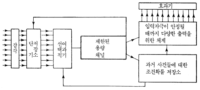 1958 ³â¿¡ ºê·Îµåº¥Æ® (D. Broadbent) ´Â ¡º Áö°¢°ú Åë½Å (Perception and Communication) ¡»À̶õ Ã¥¿¡¼ °¨°¢°ú ´Ü±â±â¾ï, Àå±â±â¾ï °£ÀÇ Á¤º¸ÀÇ È帧¿¡ ´ëÇØ ÇÑ ÀÌ·ÐÀ» Á¦¾ÈÇß´Ù. ±×´Â ±× ÀÌ·ÐÀ» ´ç´ë¿¡´Â ½Å±âÇßÀ» ³×¸ðÄ µµÇ¥ ¹æ½ÄÀ» »ç¿ëÇØ¼ ¿ä¾àÇß´Ù. ÀÌ´Â ±×¸² 8.2 ¿¡¼ Á¦½ÃµÇ°í ÀÖ´Ù. ±×ÀÇ ÀÌ·ÐÀÇ ÇÙ½ÉÀº Àΰ£ÀÌ ÃæºÐÈ÷ ó¸®Çϱ⿡´Â ³Ê¹« ¸¹Àº Á¤º¸°¡ °¨°¢±â°üµé¿¡ ºÎµúÃĿ´ٴ °ÍÀÌ´Ù. µû¶ó¼ ¼±ÅÃÀû ¿©°ú±â°¡ ÀÛ¿ëÇÏ¿©, ¾î¶² Á¤º¸°¡ ÃßÈÄÀÇ Ã³¸®¸¦ À§ÇØ Á¦ÇÑµÈ ¿ë·®ÀÇ <°æ·Î (channel)> ¸¦ Åë°úÇØ °¡¾ß ÇÒÁö¸¦ °áÁ¤ÇÑ´Ù´Â °ÍÀÌ´Ù. ¿¹¸¦ µé¾î ¸¸¾à¿¡ ¿©·¯ºÐÀÌ Ä¬Å×ÀÏ ÆÄƼ¿¡ Âü¼®ÇØ ÀÖ´Ù¸é, ¼±ÅÃÀûÀÎ ¿©°ú±â´Â ¿©·¯ºÐÀ¸·Î ÇÏ¿©±Ý ÇϳªÀÇ Æ¯Á¤ ´ëÈ¿¡ ÁÖÀǸ¦ ÁýÁßÇÏ°Ô ÇÏ°í ¸ðµç ´Ù¸¥ ¼Ò¸®µéÀº ±Í¿¡ µé¸®Áö¸¸ ¹«½ÃÇϵµ·Ï ÇÒ ¼ö ÀÖ´Ù. ±× ¿©°ú±â´Â Àå±â±â¾ï¿¡ ÀÇÇØ ÅëÁ¦µÇ¸ç, µû¶ó¼ ¸¸¾à¿¡ ¿©·¯ºÐÀÇ À̸§ÀÌ ´Ù¸¥ ´ëÈ¿¡¼ ¾ð±ÞµÇ¸é ±× ¿©°ú±â´Â Áï½Ã ¿©·¯ºÐÀÇ ÁÖÀǸ¦ ±× ´ëÈ·Î µ¹·Á³õ´Â´Ù. ¸¸¾à¿¡ ¿©·¯ºÐÀÌ ¹è°¡ °íÇÁ´Ù¸é ¿©°ú±â´Â ¿©·¯ºÐÀÇ ½ÅüÀû ¿å±¸¿¡ ÀûÀýÇÑ Á¤º¸¸¦ ¼±ÅÃÇϵµ·Ï Á¶ÀýµÉ °ÍÀ̰í, ¿©·¯ºÐÀÇ ÇൿÀ» ÅëÁ¦Çϴ ü°è´Â ±×·¯ÇÑ »óÅÂÀÇ »ç°ÇÀ» ¸¸³¯ ±âȸµéÀ» Áõ°¡½Ã۵µ·Ï ÀÛ¿ëÇÒ °ÍÀÌ´Ù. ¿©·¯ºÐÀÇ ÇൿÀº °ú°Å °æÇèÀÇ ±â¾ïµé¿¡ ÀÇÇØ Áö¹èµÈ´Ù. °ú°Å °æÇèÀº ¾î¶² »ç°ÇÀÌ ÀϾÀ» ¶§ ´Ù¸¥ ÇÑ »ç°ÇÀÌ ÀϾ È®·ü¿¡ ´ëÇÑ Áö½ÄÀÇ ÇüÅ·ΠÀúÀåµÈ´Ù. ¿©·¯ºÐÀÇ ´Ü±â±â¾ïÀº µé¾î¿Â °¨°¢Á¤º¸¸¦ ±×°ÍÀÌ ¿©°ú±â¿¡ ÀÇÇØ ¼±Åõǰųª ¾Æ´Ï¸é ´Ù¸¥ ÀÔ·ÂÁ¤º¸¿¡ ÀÇÇØ ´ëÄ¡µÉ ¶§±îÁö ¸î ÃÊ µ¿¾È ºÙÀâ¾ÆµÐ´Ù. ÀÌ ´ë½Å¿¡ Á¦ÇÑµÈ ¿ë·®ÀÇ °æ·Î¸¦ Åë°úÇÑ Á¤º¸´Â ´Ü±â±â¾ïÀÇ Åë·Î¸¦ ÅëÇØ Àç¼øÈ¯µÉ ¼ö ÀÖ´Ù. ÀÌ·¯ÇÑ ³ë¼±Àº ¿©·¯ºÐÀÌ ¸¶À½¼ÓÀ¸·Î µÇ³úÀÏ ¶§ ÀÚ·á°¡ °è¼Ó ¼øÈ¯µÇ¾î ·çÇÁ¿¡¼ µ¹°í µµ´Â °ÍÀ» Çã¿ëÇÑ´Ù. ±×·¯³ª ¿©·¯ºÐÀÌ ¹Ýº¹ ¾Ï¼ÛÇÏ´Â µ¿¾È, ±× Á¦ÇÑµÈ ¿ë·®ÀÇ °æ·Î¿¡¼´Â ¾î¶² ´Ù¸¥ °ÍÀ» ´Ù·ê ¿ë·®Àº ¾ÆÁÖ Àû¾îÁú °ÍÀÌ´Ù.
