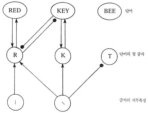 ÀμâµÈ ´Ü¾îµéÀ» ÀçÀÎÇÏ´Â Àΰ£ ÀÎÃâü°èÀÇ È¿À²¼ºÀ» ¿ì¸®´Â ¾î¶»°Ô ¼³¸íÇÒ ¼ö Àִ°¡? ÇϳªÀÇ °¡¼³Àº ´Ü¼µéÀÌ ±â¾ïÀÇ ¸ðµç ³»¿ë°ú µ¿½ÃÀûÀ¸·Î ºÎÇÕµÉ ¼ö ÀÖ´Ù´Â °ÍÀ¸·Î, ÀÌ´Â °è»ê±â¿ë ±¸¸Û ¶Õ¸° Ä«µåÀÇ ²Ù·¯¹Ì¿¡ ¶ß°³Áú ¹Ù´ÃµéÀ» µ¿½Ã¿¡ Â´Â °Í¿¡ ºñ±³ÇÒ ¼ö ÀÖ´Ù. ´õ ³ªÀº ÀÌ·ÐÀÌ ¸ÅŬ¸®·£µå (Jay McClelland) ¿Í ·¯¸áÇÏÆ® (Dave Rumelhart) ¿¡ ÀÇÇØ Á¦¾ÈµÇ¾ú´Ù. ±×µéÀº °¡´ÉÇÑ °¢ ´Ü¾î°¡ °¢°¢ ºÐ¸®µÈ º°°³ÀÇ Ã³¸® ´ÜÀ§·Î Ç¥»óµÈ´Ù°í °¡Á¤ÇÏ¿´´Ù. ±×¸®°í ±×¿Í ¸¶Âù°¡Áö·Î ÇÑ ´Ü¾î ³»ÀÇ °¢ À§Ä¡¿¡ ÀÖ´Â °¢ ±ÛÀÚµµ º°°³ÀÇ ´ÜÀ§·Î Ç¥»óµÈ´Ù´Â °ÍÀÌ´Ù. ´ÜÀ§µéÀº ¼Ò±Ô¸ðÀÇ Ã³¸®±â·Î¼, ¼·Î ¿¬°áµÇ¸ç º´·ÄÀûÀ¸·Î °è»êÀ» ÇÑ´Ù. ´ÜÀ§µéÀº °¢°¢ ƯÁ¤ Ȱµ¿¼öÁØÀ» °¡Áö¸ç, ±× Ȱµ¿¼öÁØÀº ¸Å¼ø°£ ´Þ¶óÁú ¼ö ÀÖ´Ù. Ȱµ¿¼öÁØÀº ÇÑ ´ÜÀ§°¡ Ç¥»óÇÏ´Â Ç׸ñ¿¡ ´ëÇØ ÇöÀç ¾ó¸¶³ª ¸¹Àº ÁöÁö°¡ Àִ°¡¿Í °ü·ÃµÈ´Ù. ¾î¶² ´ÜÀ§µé ½×Àº »óÈ£ ÁöÁö °¡´É¼ºÀ» ³ªÅ¸³½´Ù. ¿¹¸¦ µé¾î ±× ´Ü¾îÀÇ Ã¹ ±ÛÀÚ°¡ <R> ÀÏ °¡´É¼º°ú, ÀüüÀûÀ¸·Î ±× ´Ü¾î´Â <RED> °¡ µÉ °¡´É¼ºÀÌ´Ù. ±×·¯ÇÑ ´ÜÀ§ ½ÖµéÀº ¼·Î ¼·Î ÈïºÐ½Ã۵µ·Ï ¹¿© ÀÖ¾î, ÇϳªÀÇ ´ÜÀ§°¡ Ȱ¼ºÈµÇ¸é ±×°ÍÀº ´Ù¸¥ ´ÜÀ§ÀÇ È°µ¿¼öÁØÀ» Áõ°¡½ÃŲ´Ù. ¾î¶² ´ÜÀ§µé ½ÖÀº ºñÀϰü¼ºÀÇ °¡´É¼ºÀ» ³ªÅ¸³½´Ù. ¿¹¸¦ µé¾î ±× ´Ü¾îÀÇ Ã¹ ±ÛÀÚ´Â <R> ÀÏ °¡´É¼º°ú, ±× ´Ü¾îÀÇ Ã¹ ±ÛÀÚ´Â <B> ÀÏ °¡´É¼ºÀÌ´Ù. ±×·¯ÇÑ ´ÜÀ§ ½ÖµéÀº ¼·Î¸¦ ¾ïÁ¦Çϵµ·Ï ¹¿© ÀÖ´Ù : Áï ÇÑ ´ÜÀ§°¡ Ȱ¼ºÈµÇ¸é ±×°ÍÀº ´Ù¸¥ ´ÜÀ§ÀÇ È°µ¿¼öÁØÀ» °¨¼Ò½ÃŲ´Ù.