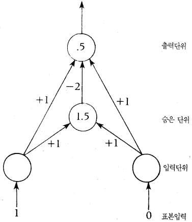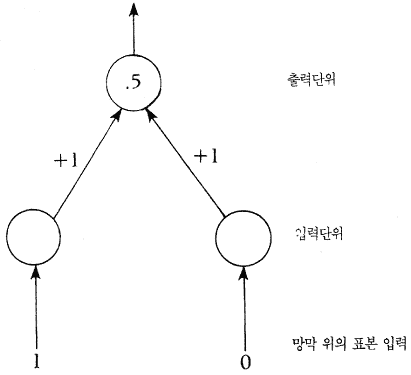 ±×¸² 10.3 Àº ÇϳªÀÇ ´Ü¼ø ÆÛ¼ÁÆ®·ÐÀ» Á¦½ÃÇϰí ÀÖ´Ù. ±×°ÍÀº ¹«½ÃÇÒ ¸¸ÇÑ ¿ªÄ¡ ¼öÁØÀ» °¡Áø µÎ °³ÀÇ ÀԷ´ÜÀ§¿¡ 0.5 ÀÇ ¿ªÄ¡¸¦ °®´Â Ãâ·Â´ÜÀ§°¡ ¿¬°áµÇ¾î ÀÖ´Ù. µÎ ÀԷ´ÜÀ§¿Í Ãâ·Â´ÜÀ§¿ÍÀÇ ¿¬°á°µµ´Â ¸ðµÎ +1 ÀÌ´Ù. µû¶ó¼ ¸¸¾à¿¡ ÇϳªÀÇ ÀԷ´ÜÀ§°¡ Ȱ¼ºÈµÈ´Ù¸é, ±×°ÍÀº Ãâ·Â´ÜÀ§¿¡ +1 ÀÇ °ªÀ» Àü´ÞÇÒ °ÍÀÌ´Ù. ÀÌ °ªÀº Ãâ·Â´ÜÀ§ÀÇ ¿ªÄ¡¸¦ ³ÑÀ¸¹Ç·Î ±× ´ÜÀ§´Â ¹ßÈÇÒ °ÍÀÌ´Ù. µÎ °³ÀÇ ÀÔ·ÂÀÌ ¸ðµÎ Ȱ¼ºÈµÇÁö ¾ÊÀ» ¶§¿¡¸¸ ¹ßÈ´Â ½ÇÆÐÇÑ´Ù. ÀÌ¿Í °°ÀÌ ±× ¸Áü°è´Â Æ÷°ýÀû ¼±Á¢ (inclusive disjunction) À» ÀÎÁöÇÑ´Ù. Áï ÀԷ´ÜÀ§µé Áß ¾î´À °Í (ÀÌ°Í ¶Ç´Â Àú°Í ¾Æ´Ï¸é µÑ´Ù ¸ðµÎ) ÀÌ¶óµµ È°¼ºÈÇϸé ÀÎÁöÇÑ´Ù.