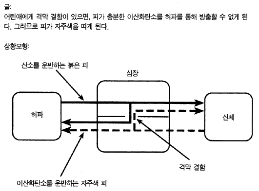 ±×¸² 5 ´Â µÎ-¹®ÀåÀ¸·Î µÈ ±Û Á¶°¢À» ¿¹·Î º¸¿©ÁØ´Ù. "¾î¸°¾Ö°¡ °Ý¸·¿¡ °áÇÔÀ» °¡Áö¸é, Ç÷¾×Àº ÃæºÐÇÑ ÀÌ»êÈź¼Ò¸¦ ÇãÆÄ¸¦ ÅëÇØ ¹æÃâÇÒ ¼ö ¾ø°Ô µÈ´Ù. ±×·¯¹Ç·Î Çǰ¡ ÀÚÁÖ»öÀ» ¶ì°Ô µÈ´Ù." ÀÌ °æ¿ìÀÇ »óȲ ¸ðÇüÀº ´ÙÀ̾î±×·¥À¸·Î Ç¥»óµÈ´Ù. ÀÌ ´ÙÀ̾îÇÁ·Î±×·¥Àº °Ý¸·ÀÇ °áÇÔ ¶§¹®¿¡, »ê¼Ò¸¦ ¿î¹ÝÇÏ´Â ºÓÀº»ö Çǰ¡ ÀÌ»êÈź¼Ò¸¦ ¿î¹ÝÇÏ´Â ÀÚÁÖ»ö ÇÇ¿Í ¼¯ÀÌ´Â °ÍÀ» º¸¿©ÁØ´Ù. ±×·¯¹Ç·Î ÀÚÁÖ»ö ÇÇÀÇ ÀϺδ ÇãÆÄ¿¡ ÀÖ´Â »ê¼Ò¸¦ °®Áö ¸øÇÑ Ã¤ ¸öÀ¸·Î µÇµ¹¾Æ¿À°Ô µÈ´Ù. »óȲ ¸ðÇü¿¡ Æ÷ÇÔµÈ ´ëºÎºÐÀÇ Á¤º¸°¡ ±Û ¼Ó¿¡¼ Á÷Á¢ ÃßÃâµÈ °ÍÀÌ ¾Æ´Ï°í ¼øÈ¯°è¿¡ °üÇÑ µ¶ÀÚÀÇ Áö½Ä¿¡¼ ÃßÃâµÈ °ÍÀ̶ó´Â Á¡À» ÁÖ¸ñÇ϶ó.